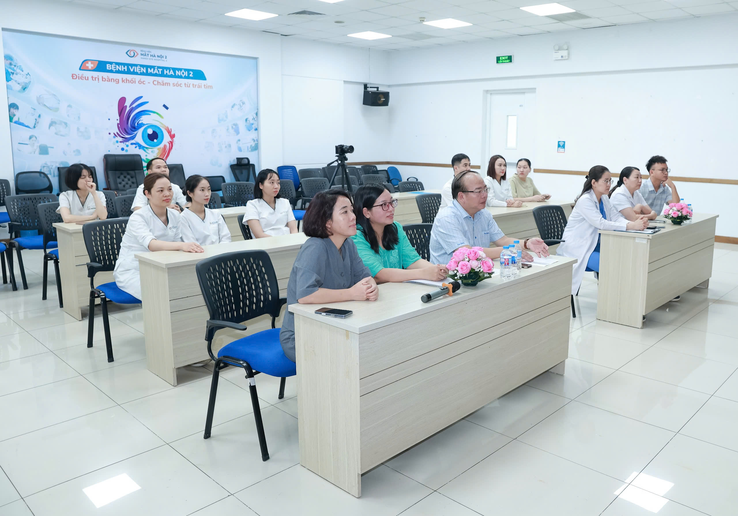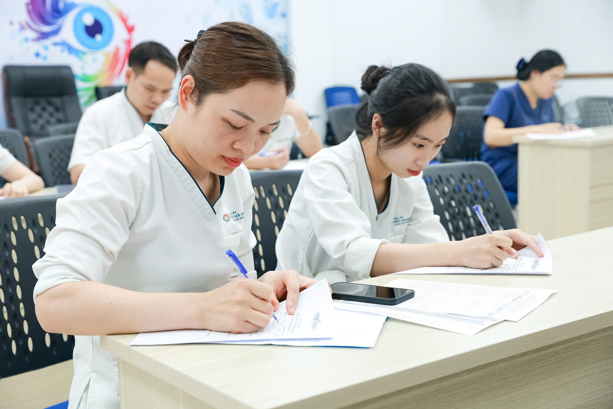 Học viên gồm 12 điều dưỡng viên đang công tác tại Bệnh viện Mắt Hà Nội 2 tham gia khóa đào tạo “Điều dưỡng chuyên khoa mắt” kéo dài 06 tháng. Đây là những điều dưỡng viên có kinh nghiệm, có bằng điều dưỡng đa khoa và chứng chỉ hành nghề theo quy định. Trong lộ trình này, các học viên sẽ củng cố nền tảng lý thuyết và có 05 tháng thực hành lâm sàng chuyên sâu. Đáng chú ý, 09 tuần thực tập tại Bệnh viện Mắt Trung ương sẽ tập trung vào các kỹ thuật nhãn khoa phức tạp như đo nhãn áp, bơm rửa lệ đạo và quy trình vô khuẩn khắt khe trong phòng mổ.